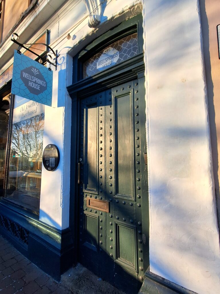 Upon arrival you will see the sign for WELLSPRINGS HOUSE above the green studded door between Alturo Lounge and Malvern Goldsmiths. If you are visiting WELLSPRINGS ART GALLERY & STUDIOS it is the door to the left of Malvern Goldsmiths.
